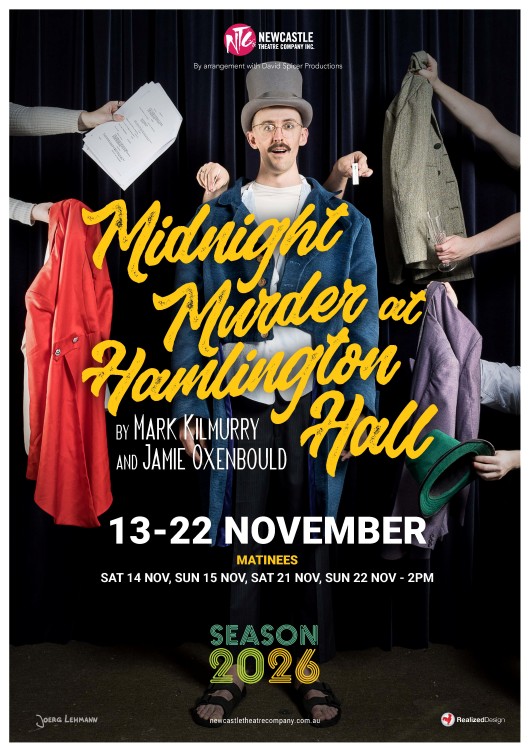 Tonight, is The Middling Cove Players opening night of their next production Midnight Murder at Hamlington Hall, however 7 of the cast have called in sick, but as they say “The Show Must Go On". With only the Director and two cast members left standing they decide that the show really MUST go on and with the help of the reluctant stage manager, her teenage niece and an unwilling audience member, opening night forges ahead. The performance takes shape in this hilarious comedy that reflects the chaos that live theatre can be.